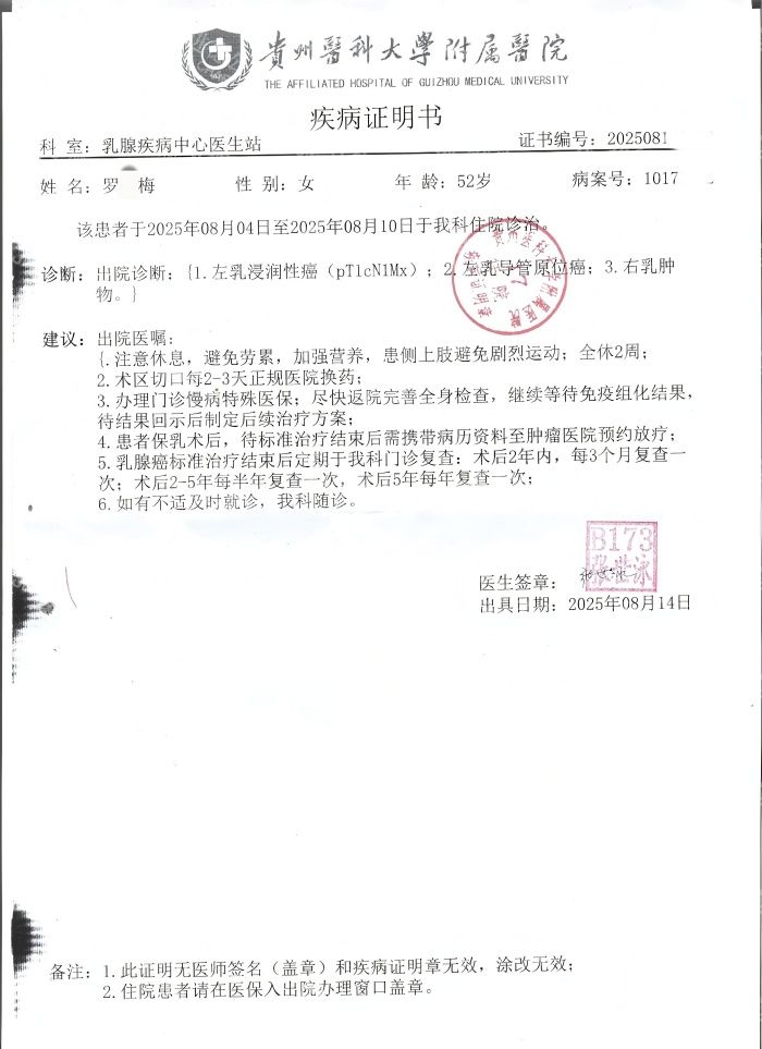 屋漏偏逢连夜雨,2025年7月,我被确诊为乳腺癌,这场突如其来的重病,让本就艰难的家庭雪上加霜。自确诊以来,我已先后完成八次化疗,身体承受着巨大的痛苦,后续还需立即进行放疗治疗,且放疗结束后仍需长期用药、复查随访,整个治疗周期漫长,后续医疗费用缺口极大。