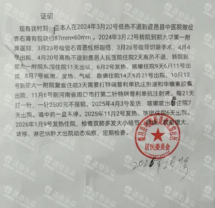 3月22日转至郑州大学第一附属医院,3月23日被确诊为右肾恶性细胞癌,3月28日接受了肾切除手术,4月4日出院。