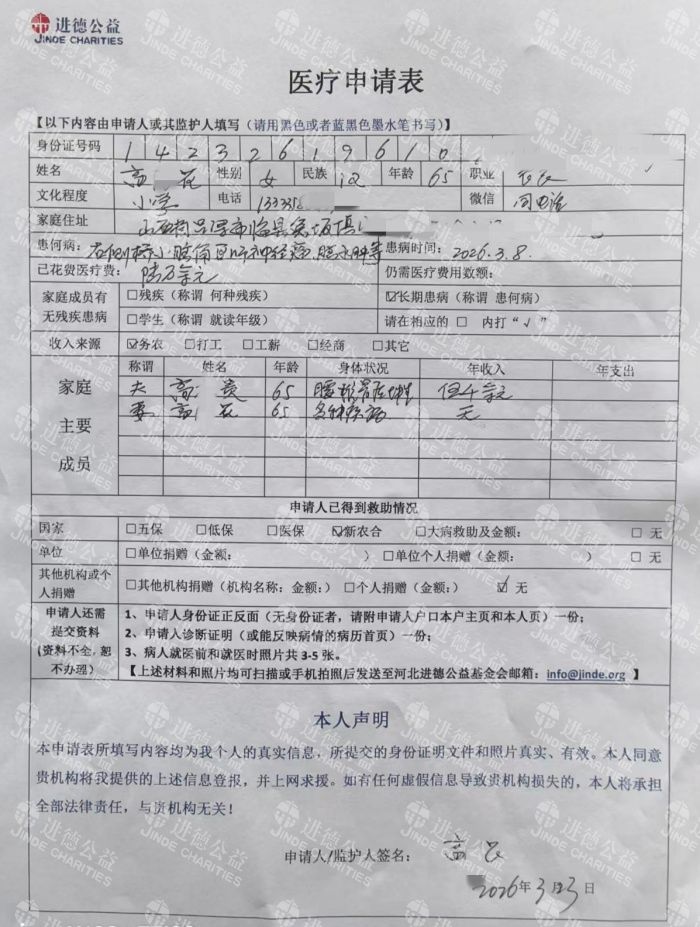 大家好,我叫高*花,今年65岁,此刻我怀着无比绝望又抱着一丝希望的心情,向各位爱心人士发出求助,恳请大家能伸出援手,帮我和这个濒临破碎的家庭渡过难关。