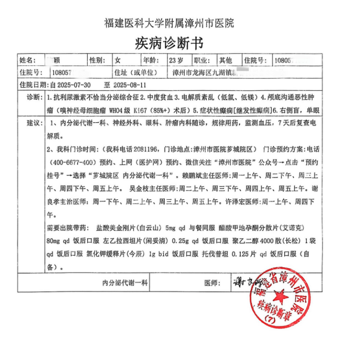 我叫*颖,今年本应是努力生活、照顾家人的年纪,却在2024年被确诊为**嗅神经母细胞瘤**,从此踏上漫长而艰难的治疗之路。如今治疗仍在继续,我无法工作、没有任何收入,家中只剩我与86岁高龄、体弱多病的奶奶相依为命,生活陷入绝境。