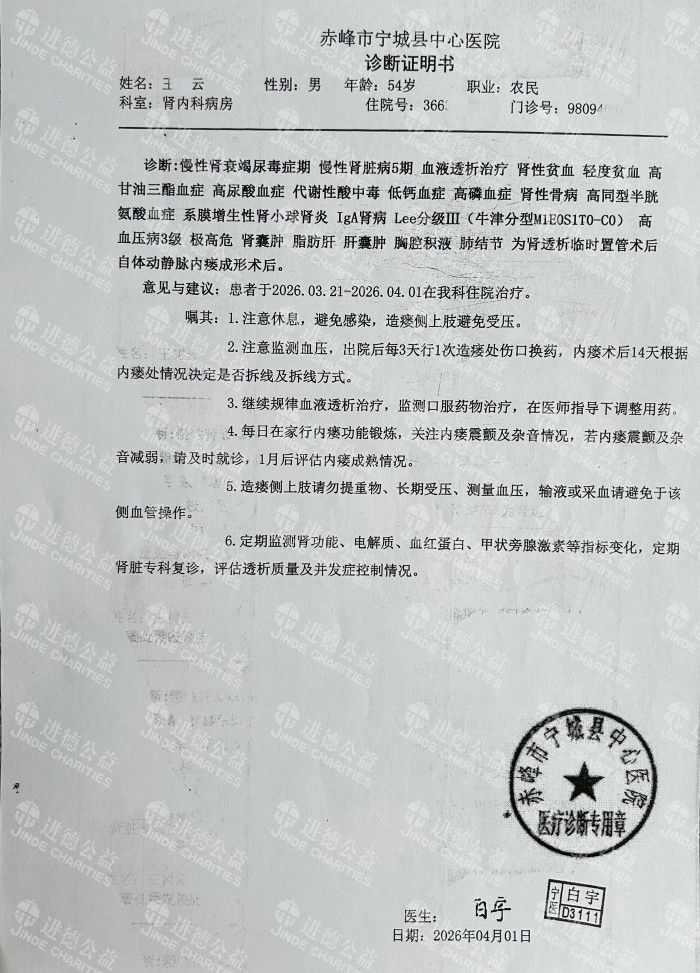 2026 年 3 月 20 日,我在赤峰市宁城县中心医院被确诊为慢性肾衰竭尿毒症期(5 期),同时伴随严重高血压、肾性贫血、肾性骨病等多种严重并发症,身体状况急剧恶化,日常起居都极为困难。因家庭实在无力承担高昂的手术及综合治疗费用,万般无奈之下只能选择保守治疗。如今虽已暂时出院,但病情不容丝毫耽搁,必须每两天进行一次血液透析才能勉强维持生命,仅透析及后续用药开支就已压得整个家庭喘不过气,后续长期治疗更是遥遥无期、费用巨大。