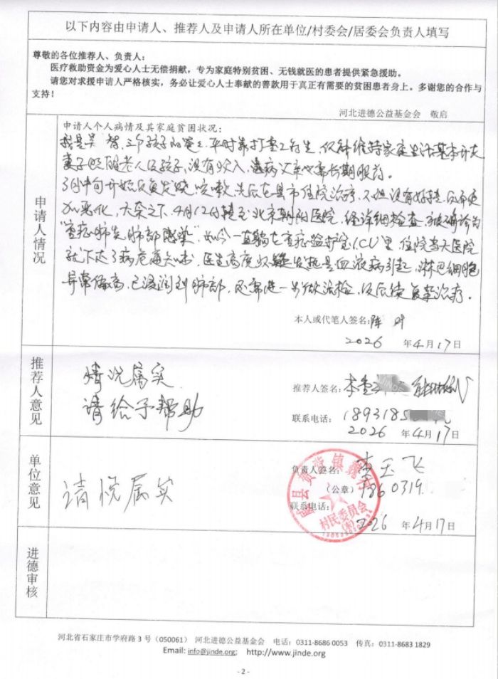 面对巨额的治疗费用,本就拮据的家庭早已无力承担,实在走投无路,恳请社会各界爱心人士伸出援手,帮帮我们这个濒临崩溃的家庭,您的点滴善意,都是我老公活下去的希望,我们全家感激不尽!