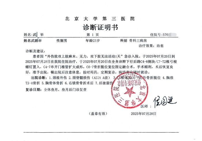 2025 年,我在北京不幸遭遇车祸,当即被送往北京医学附属医院抢救,术后又转至首都医科大学附属医院。医生诊断结果如同晴天霹雳:伤情极其严重,我胸以下已完全失去知觉,全身无法动弹,彻底丧失了生活自理能力。