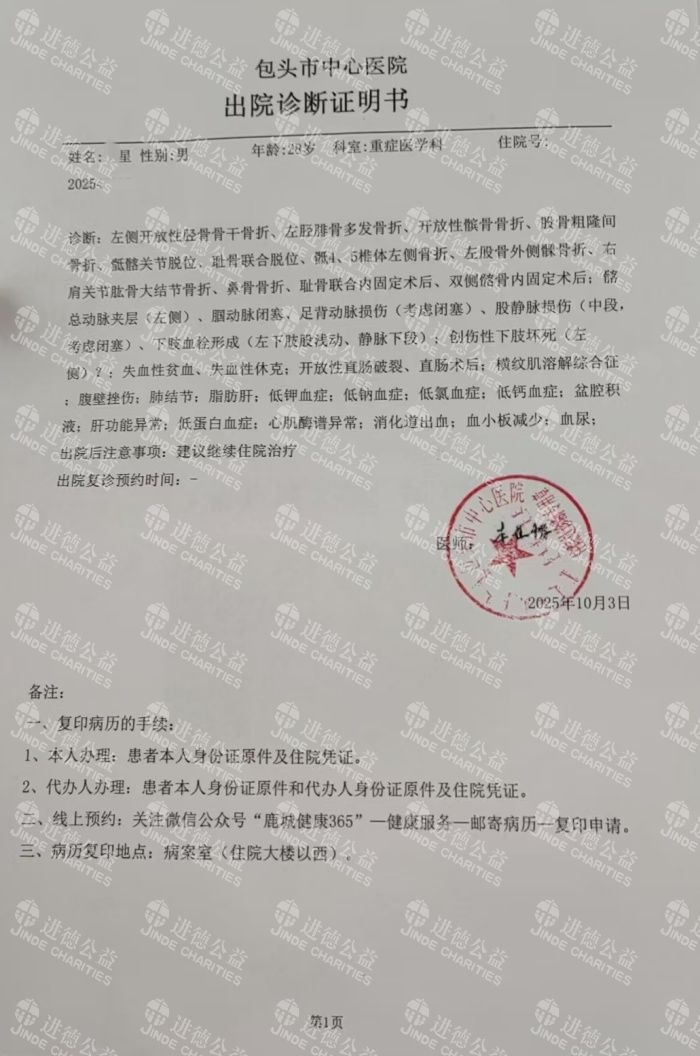我家老大 * 星今年 28 岁,正是为家扛事的年纪,一场意外却让我们本不富裕的家彻底陷入绝境。2025 年 9 月 30 日凌晨,他下班回家路上遭遇车祸,当场昏迷,被紧急送往包头市中心医院重症监护室。