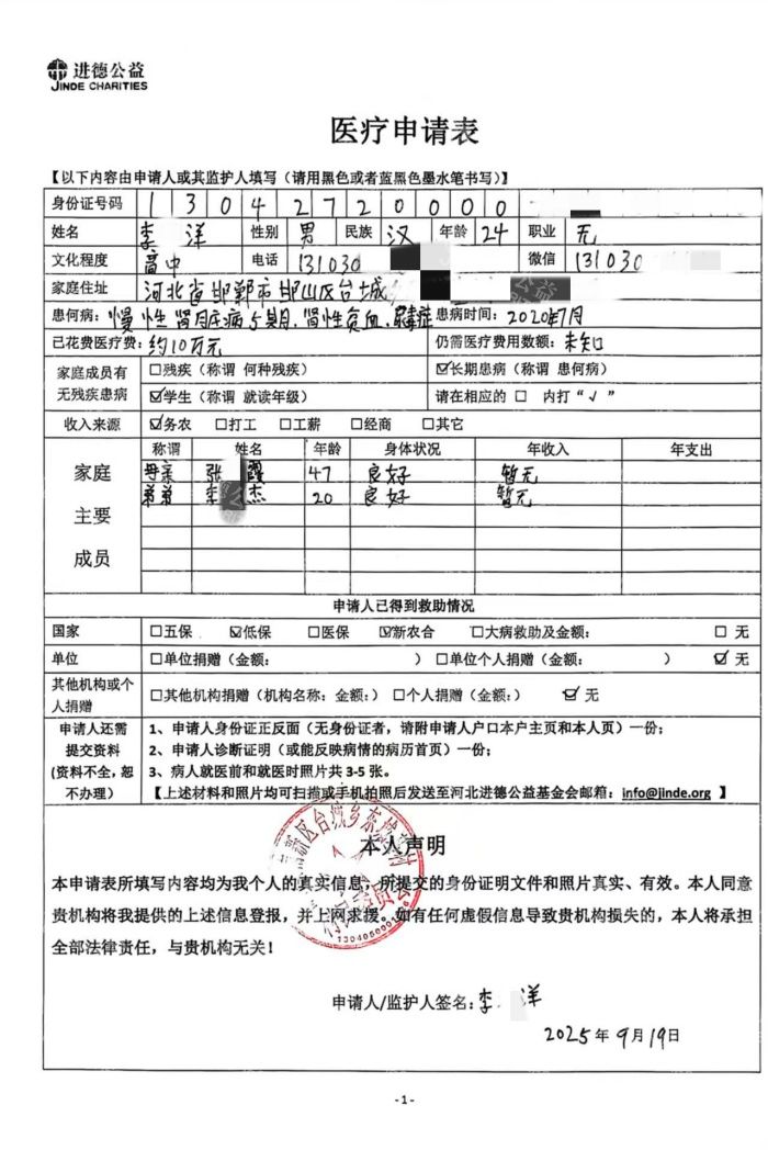 我是河北省邯山区的一名青年,2020 年高中毕业时,一次常规体检打破了原本平静的生活 —— 血压检测结果异常偏高。为查明原因,我前往医院住院检查,最终被确诊为肾炎。本以为积极治疗就能控制病情,可命运却不断加码,到 2025 年,我的病情已恶化至慢性肾脏病 5 期,也就是大家常说的尿毒症。